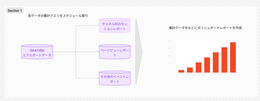 図のように、ROWデータの必要な要素をあらかじめテーブルとして保存することで、データフロー全体のクエリ量を削減することができます。保持するイベントの種類にもよりますが、この中間処理を行うだけでクエリ量を90%以上削減できる場合が多いです。