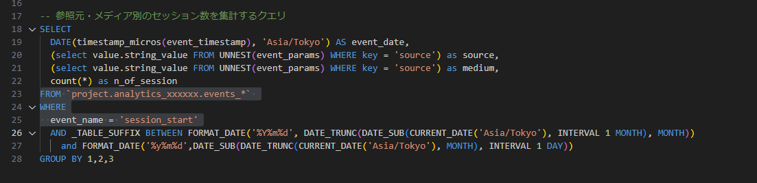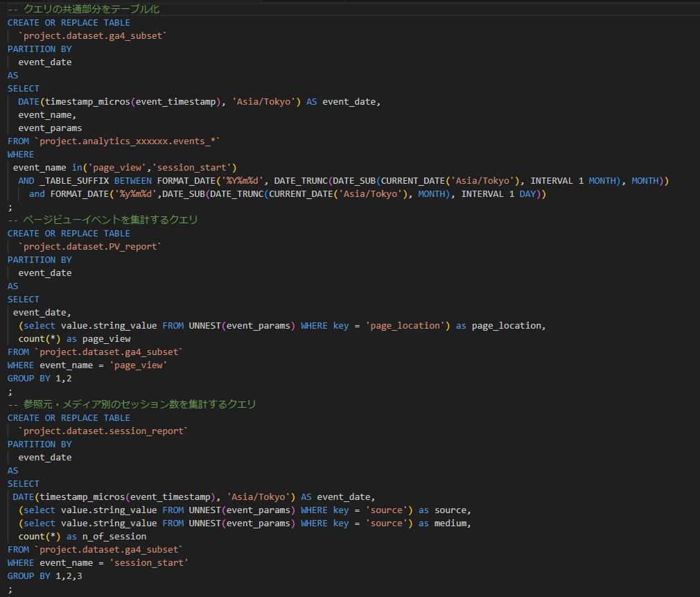 上記のパターンだとGA4のRawデータを複数読み込んでおり、クエリ量が無駄になっています。これを紐解くために以下のサンプルクエリを見てみましょう。