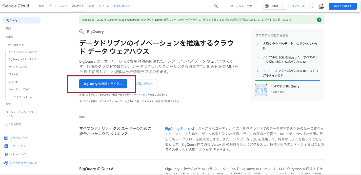まず、Google Cloud 公式サイトへアクセスし、「BigQueryの無料トライアル」をクリックします。