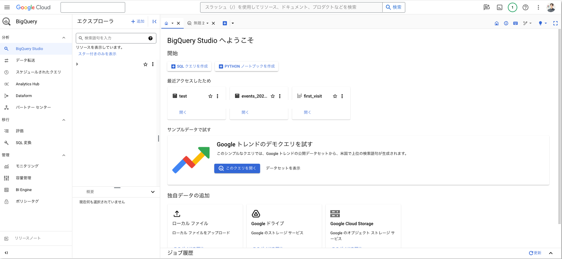 BigQueryのコンソール画面が表示されます。