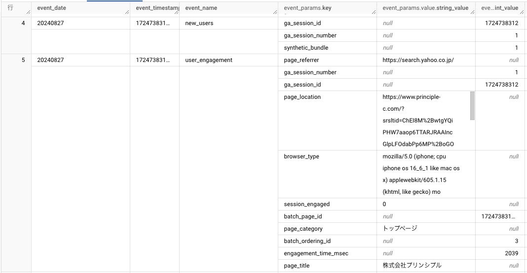 上記SQLの「UNNEST」が入れ子の解除を行う処理です。これにより、イベントパラメータとして格納されているページURLの情報を抽出できます。