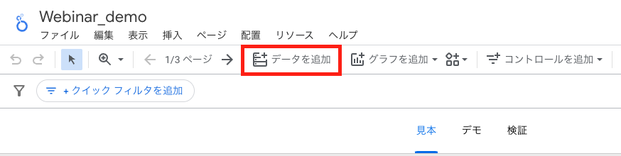 Looker Studioの上部メニュータブから「データを追加」を押下します。