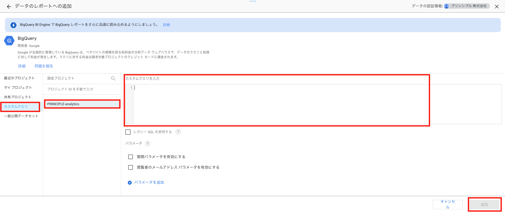 左側のメニューから「カスタムクエリ」を選択し、課金対象のプロジェクトを選択します。そして右側に表示されるボックスにSQLクエリを入力し、「追加」を押下します。
