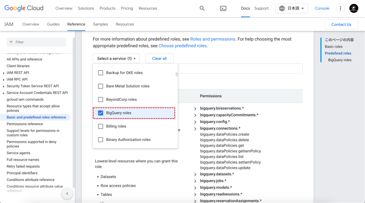 Google Cloudでは、さまざまな予め定義された役割が用意されており、それぞれが特定の権限(パーミッション)を持っています。これらの役割は、BigQueryを含む様々なGoogle Cloudサービスでのアクセス権限を管理するために使用されます。役割とそれに関連する権限の詳細は、以下のURLにアクセスし画面中段にあるBigQueryにチェックすることでロール一覧が確認できます。ご自身の状況や必要なロールを確認することもお勧めします。