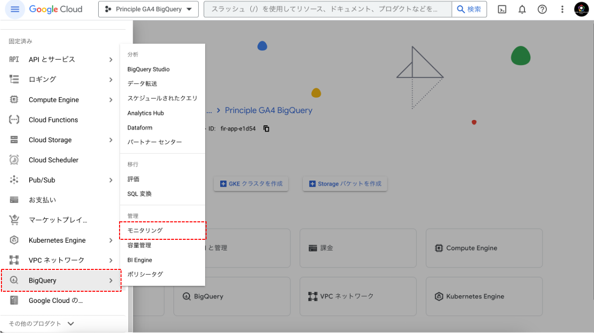 - ナビゲーションメニューから「BigQuery」をカーソルをおき表示メニューから、「モニタリング」にアクセスします。