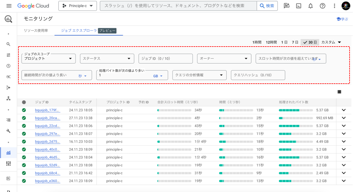 ジョブエクスプローラでは、上の図に赤枠で示した部分を使って、対象範囲を指定し、ジョブ一覧をスロット時間やデータ量でフィルタすることが可能です。これにより、CLIでのコマンド実行の場合で生じていたジョブ一覧のJSON出力やその後のCSVへの整形処理といった一手間が省けます。結果として、コストが高くなっているスロークエリを比較的スムーズに特定することが可能となります。