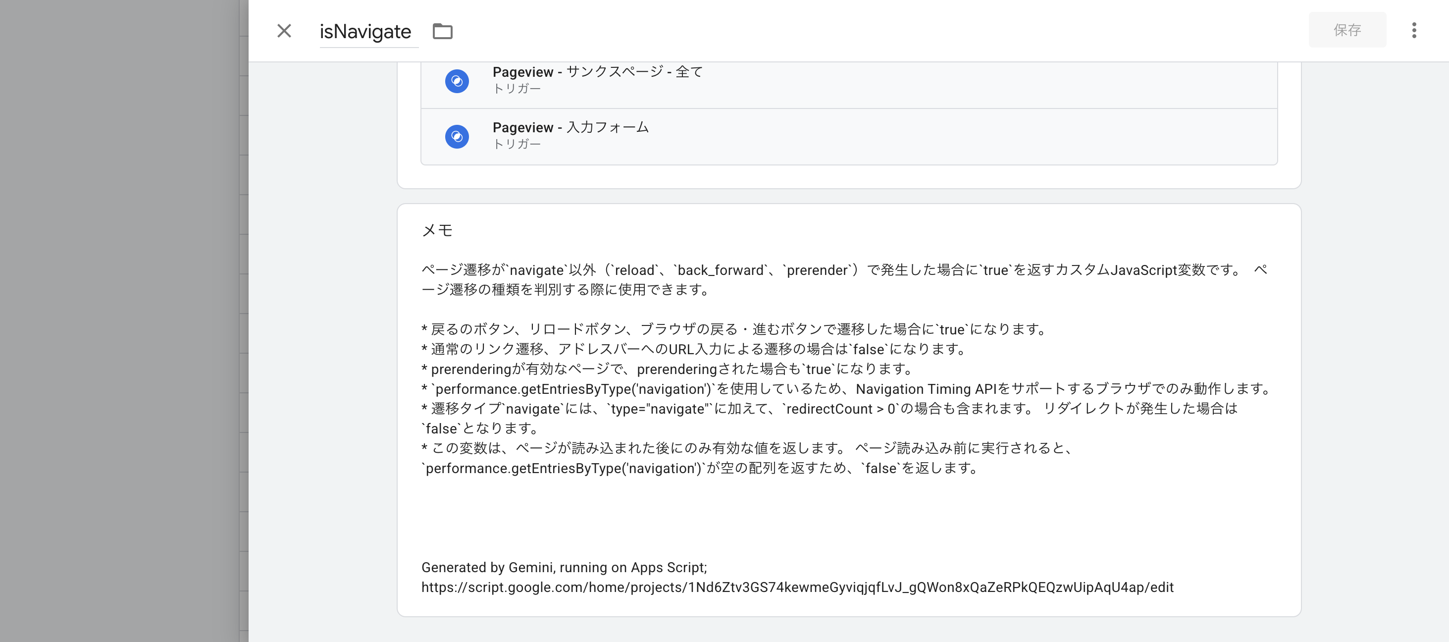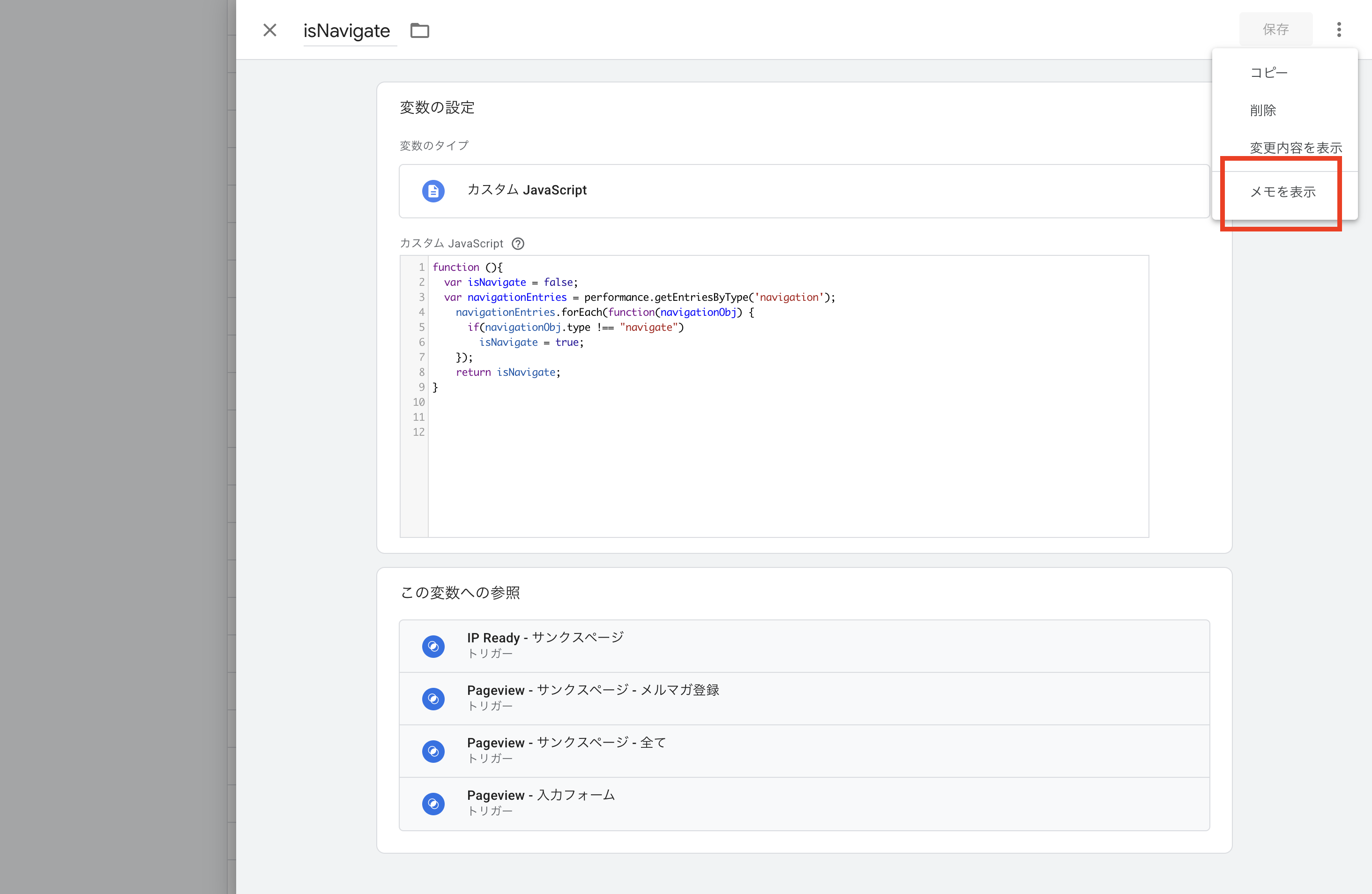 次のGoogleタグマネージャーの変数の挙動を読み解き、変数の「メモ」欄に残すべきテキスト(どのような値を取得することができる変数であるか、使うときの注意点など)をまとめてください。