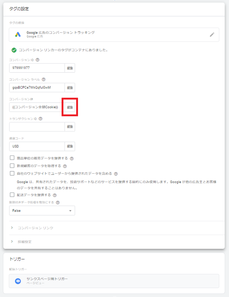 - 最後の金額をコンバージョン金額として指定し、取得