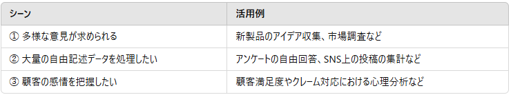 • 分析対象: SNSやレビューサイトのフリーテキスト(自由記述)部分