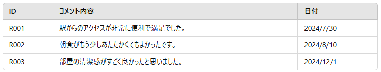 • 一般的に「ID」「コメント内容」「日付」などを1行にまとめておくと管理しやすく、後の集計やフィルタリングもスムーズです