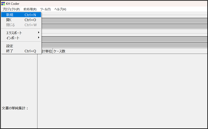 KH Coderでは、1つの分析対象データを「プロジェクト」として管理します。分析条件や処理履歴が自動的に保存されるため、あとから再開したり、条件を変えて再分析するのも簡単です。