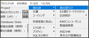 • ①メニューバーの「ツール」→「抽出語」→「抽出語リスト」を選択