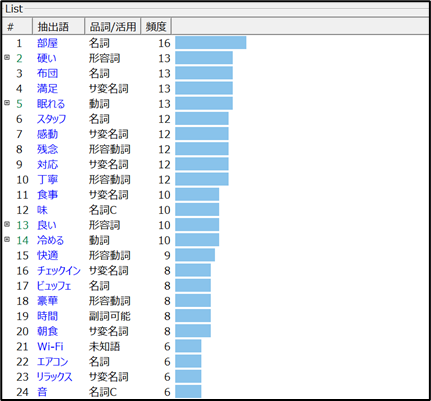 • 「部屋」と一緒に「清潔」「広い」「古い」が頻出していれば、「部屋に関する印象」が見えてきます。