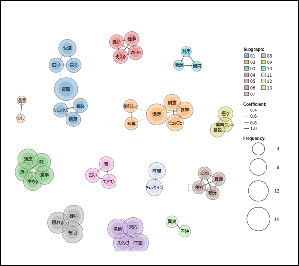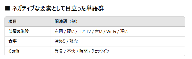 「布団が硬い」「エアコンが古い」「Wi-Fiが遅い」などの不満がネットワーク分析上でも顕著に見られました。