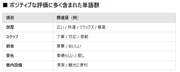 ダミーの旅館口コミデータを使った頻出語分析では、以下のような傾向が見えました。