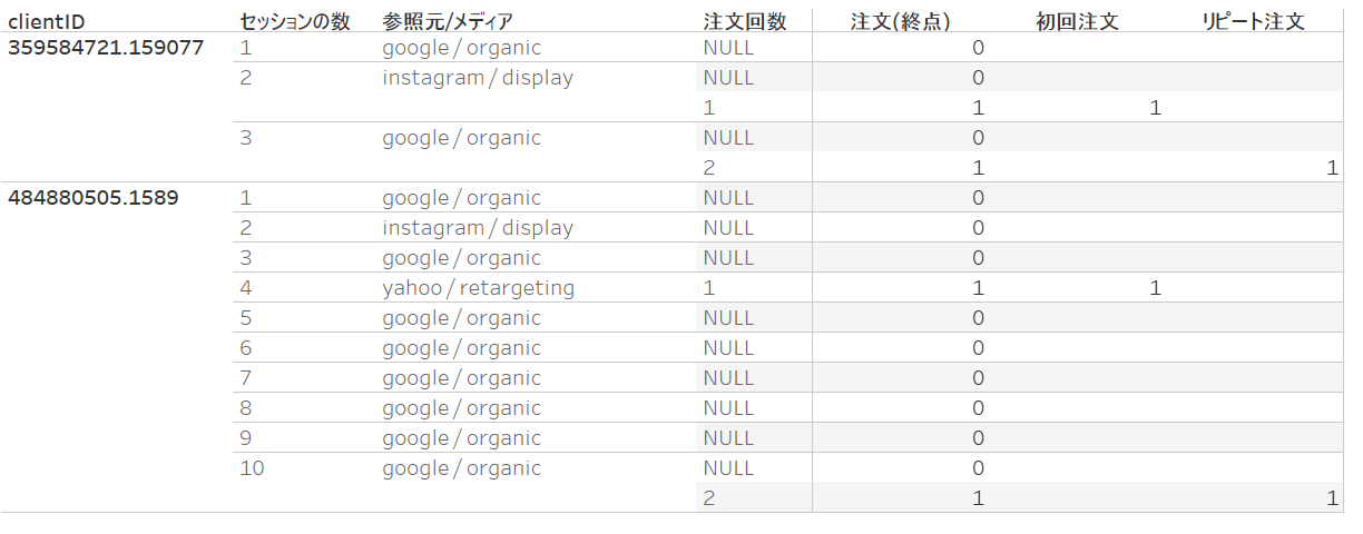 これらを実装することで、以下のようなユーザーごとにどの経路で初回注文/リピート注文が発生したのかといった明細データをAPI経由で取得し、さらにBIツールを活用することでより詳細なアトリビューション成果の分析をすることができるようになります。