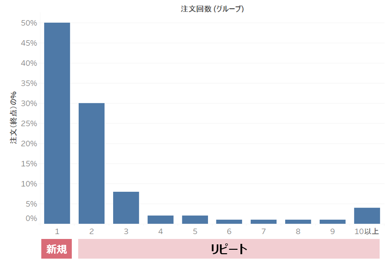上の分布図から、新規注文比率が約50%で、2回目の購入が30%と初回注文からリピート注文への移行比率が高いことが読み取れます。この場合、一度注文してもらえば、リピートに繋がりやすく売上を伸ばすために、まずは初回注文を獲得することが重要であることが推測されます。