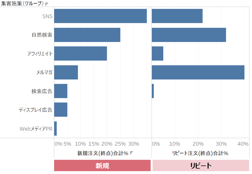 続いて、初回注文とリピート注文がどの集客施策から発生しているのかを確認します。