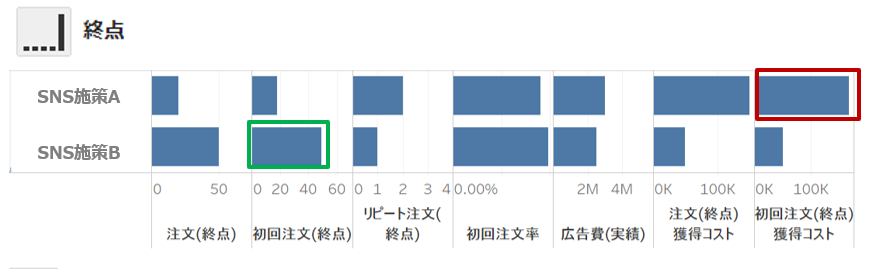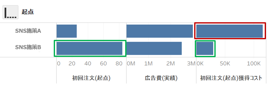 施策Aは、終点べースと起点ベースの両方で大きな変化はなく、施策Bより初回注文獲得コストが高くなっています。一方、施策Bは終点ベースより起点ベースで、初回の注文数が倍近く増え、獲得コストも半減しました。