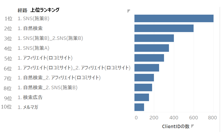 この場合、経路順でSNS、自然検索、アフィリエイトが上位を占め、複数の経路を経由せずに一施策で完結しているのが多く見られます。