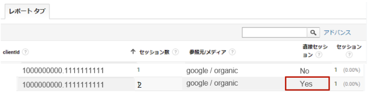 上記の場合、該当ユーザーは1回めの流入は「google/organic」で、2回めの流入も、「google/organic」となっていますが、直接セッションが「Yes」ですので、実際はダイレクトトラフィックであると判別できます。