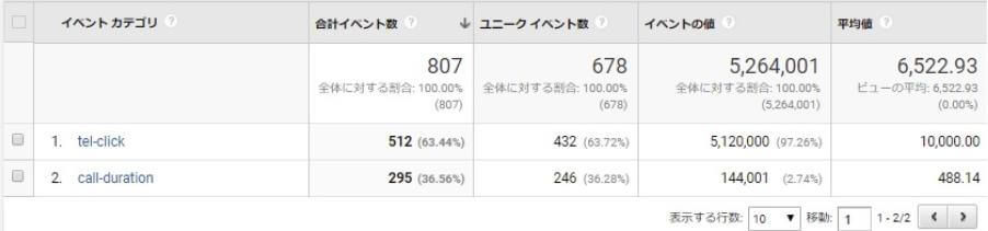 通話時間イベントでは、イベントの値として電話タップ~通話が終わって再度サイトを閲覧するまでの秒数を記録しており、イベント カテゴリレポートではその合計値と平均値が表示されます。
