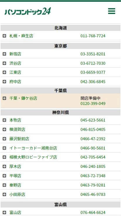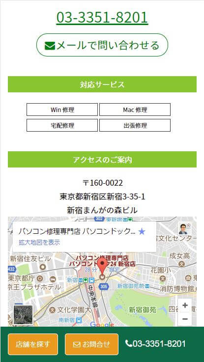 一方の各店舗ページはCall To Actionがファーストビューにある以外問題なさそうですが、スクロールダウンしていくと画面右下に電話リンクが表示されます。