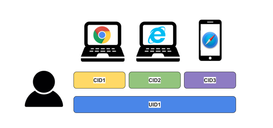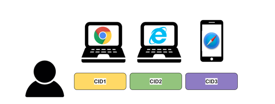 本来、GAはユーザーを特定するのに、クライアント ID(ランダムに生成され、ブラウザの Cookie に保存される固有の ID、以下CID)を利用しています。その結果、同じユーザーでも、別ブラウザー(別デバイス)に切り替える場合、CIDが異なるため、違うユーザーだとGAが認識します。(図1)