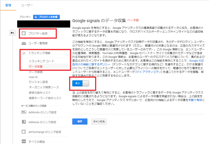 STEP3 「Google signalsのデータ収集」の下にあるボタンを「オン」にして、保存