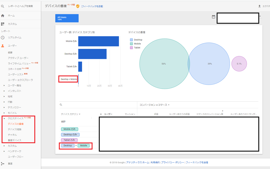 こちらのレポートにて、ユーザーがサイトにアクセスするのに、使用するデバイスの種類やパターンを確認できます。特にデバイスの重複(図4のようにモバイルとデスクトップ両方よりアクセスするユーザー)を確認し、それを単独デバイスユーザーと比較できます。