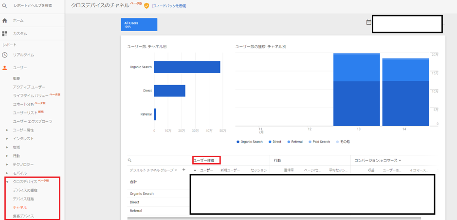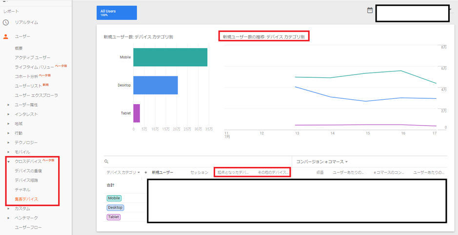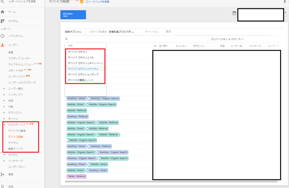 自動クロスデバイス機能用に、GA上では「クロスデバイス」(ベータ版)というレポートが表示されています。その中には「デバイスの重複」、「デバイス経路」、「チャネル」、「集客デバイス」四つレポートがあります。