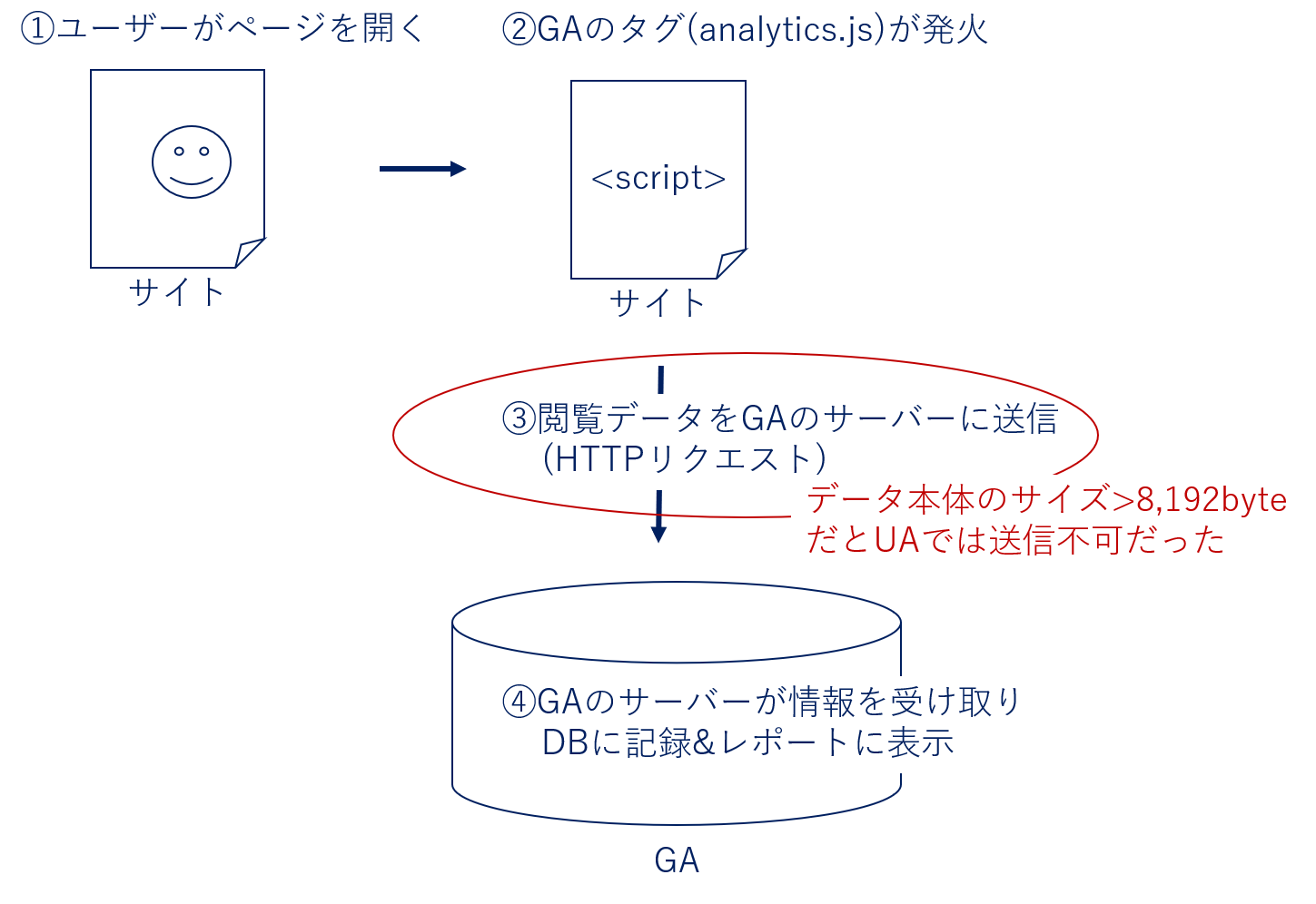 UAでは、タグから送信しようとするビーコンのデータ本体のサイズが8,192byteを超えた場合、その送信が失敗する(下記図③)ため、大口顧客のトランザクション計測が漏れる場合がありました。(*1)