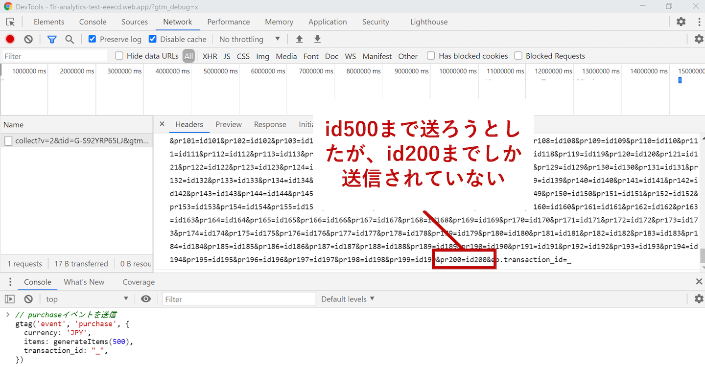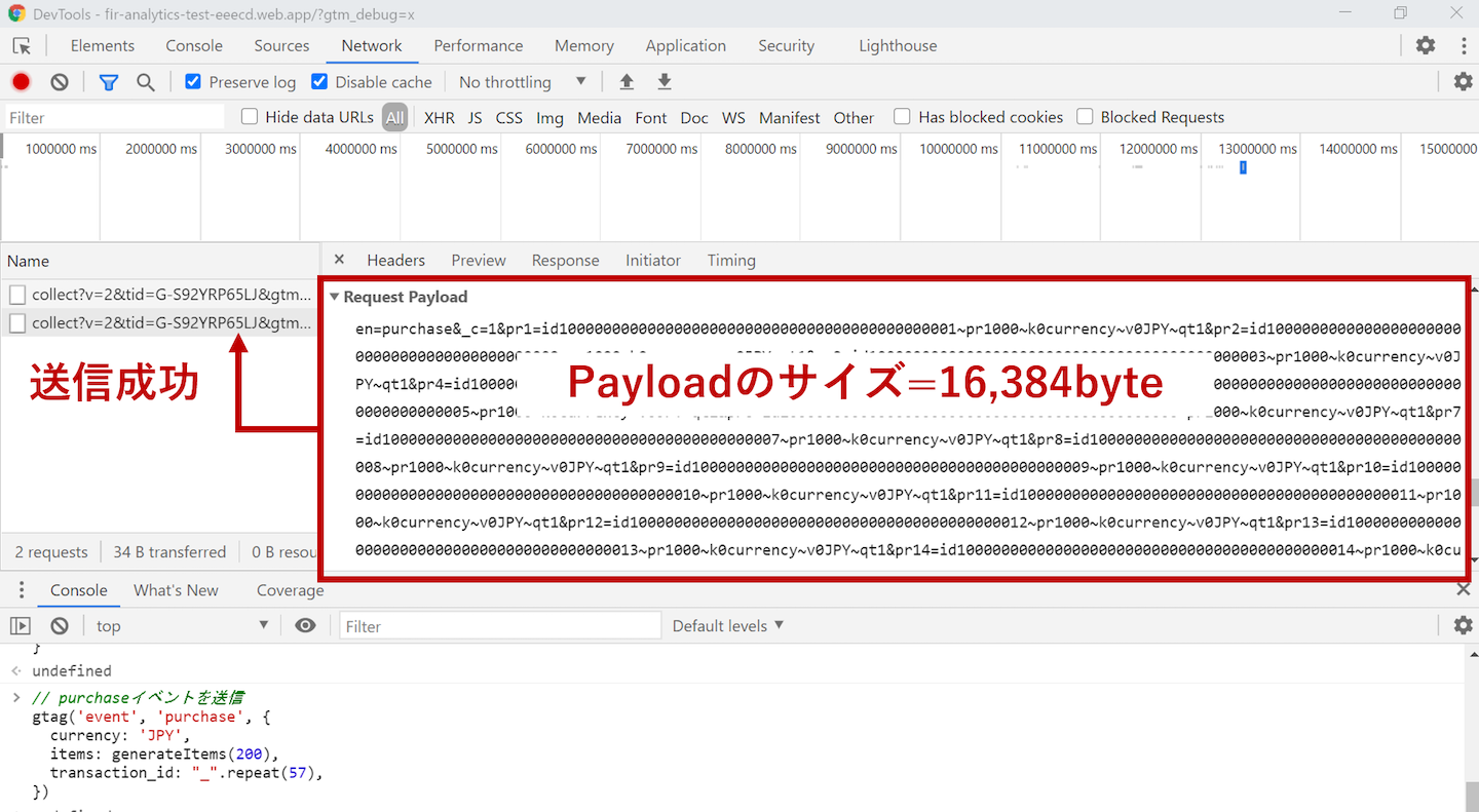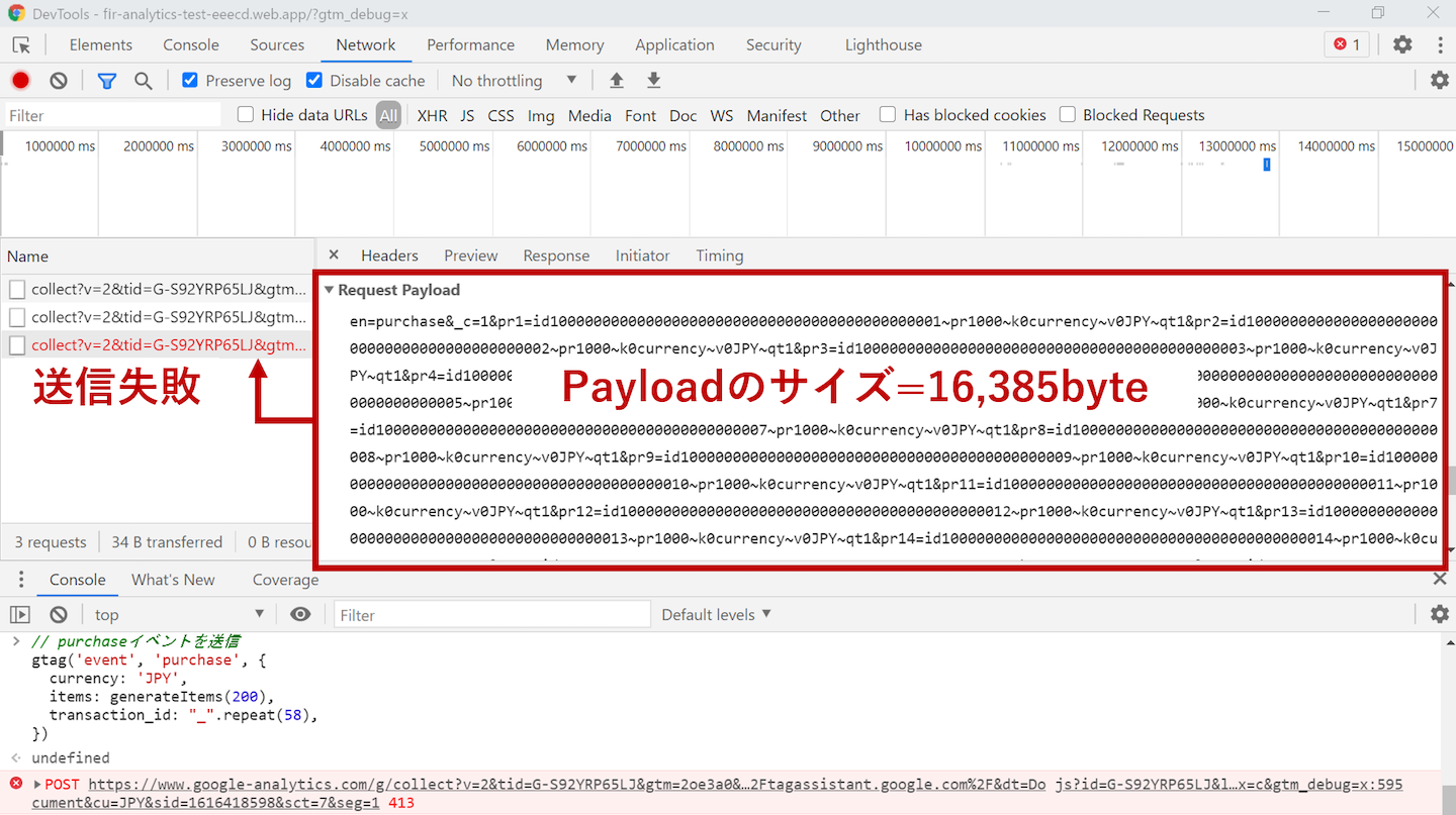 ここで言うビーコンのサイズとは、送信されているデータ本体(「ペイロード」)のテキスト数(=byte、サイズ)のことです。購入情報をGA4に送信しようとしたとき、ビーコンのデータ本体のテキスト数が16,384文字(=16,384byte)を超えていると、送信に失敗しました。送信自体が失敗するため、GAは購入情報を登録してくれませんでした。
