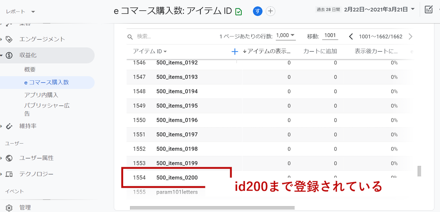 GA4のレポートでも実際に商品ID200まで登録されることが確認できました。