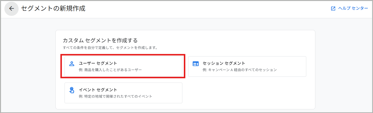 • 左側にある「セグメント」セクションの「+」ボタンをクリックし、「新しいセグメントを作成」→「ユーザーセグメント」の順に選択します。