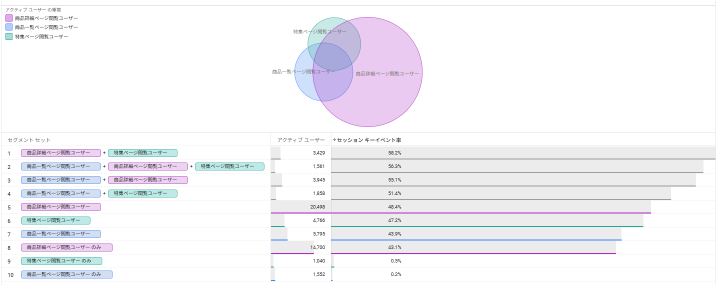 この円が重なっている部分が、「複数のセグメントに該当するユーザー」、つまり「複数のページカテゴリを閲覧したユーザー」です。グラフの下にあるテーブルには、「セグメントの組み合わせ」ごとのユーザー数が表示されます。