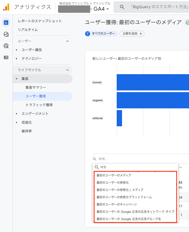 一方、GA4標準レポートの「ライフサイクル > 集客 > ユーザー獲得」レポートのディメンションを見ると、