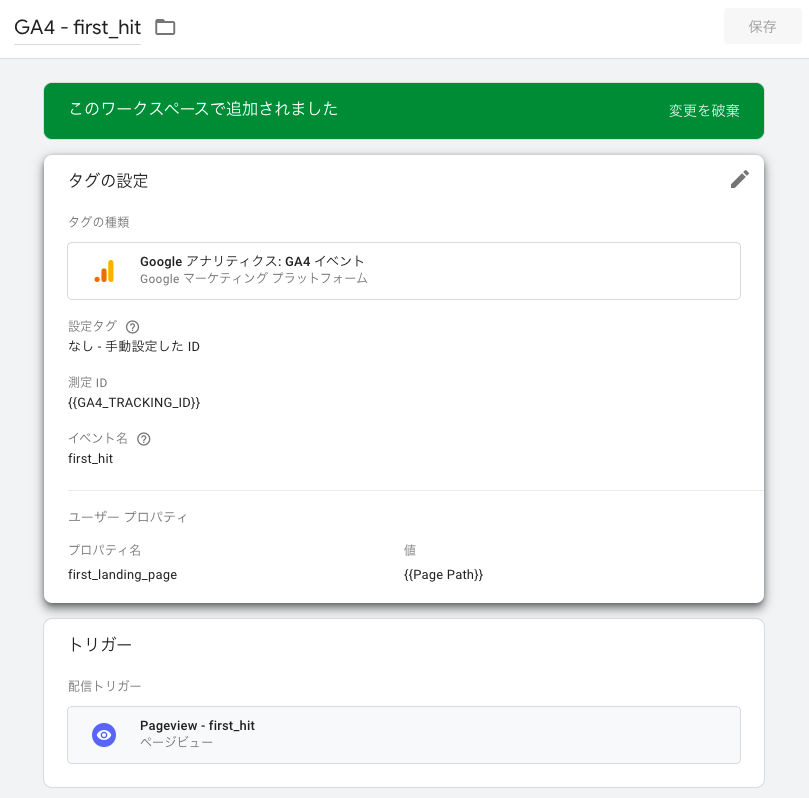 - トリガー:ファーストパーティCookie(_ga)変数がundefinedのときに発火するページビュートリガー
