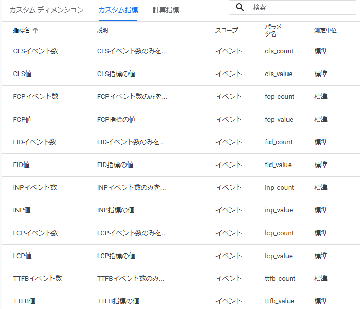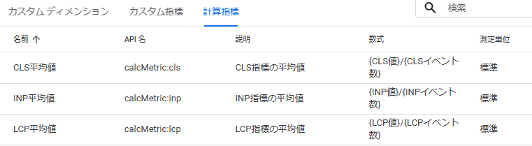 Web Vitalsの数値は、平均値を確認することが重要です。そのため、GA4の「計算指標」機能を活用し、LCP, INP, CLSなどの平均値をすぐに確認できるよう設定します。