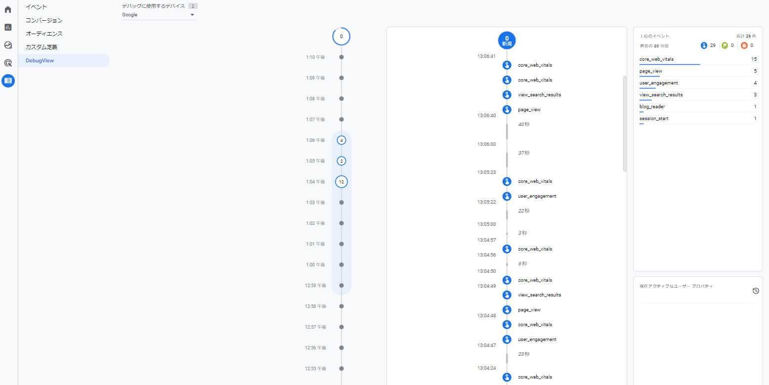 DebugViewは、GA4が収集する情報を時系列に沿って確認できるリアルタイムレポートです。GA4管理画面の [設定] > [DebugView] から確認することができます。