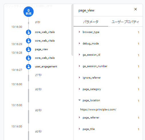 特定のイベントのパラメータ送信が上手くいっているか確認する場合、イベント名をクリックしイベントの送信内容の詳細を開いた後、対象のパラメータをクリックして値を確認します。