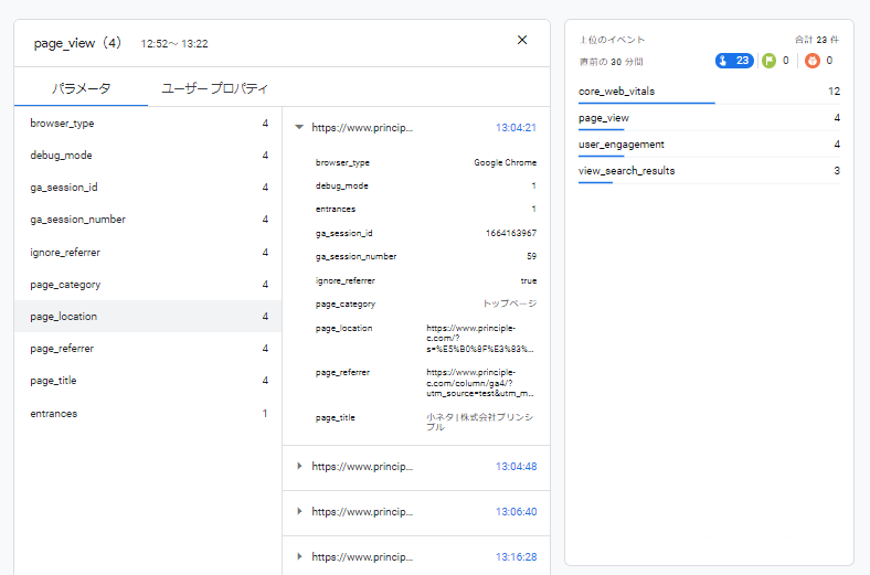 右上にはMinutesストリームが表示されており、直近30分間のイベントの発火数が表示されます。イベント名をクリックすると、時系列に沿って各パラメータやユーザープロパティの送信内容を確認することができます。1つのイベントの中で値を比較したい時に有効です。