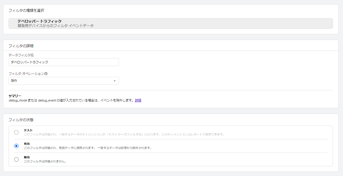 デバッグを行う際、 [管理] > [データ設定] > [データフィルタ] からデベロッパートラフィックを設定しておくのもおすすめです。