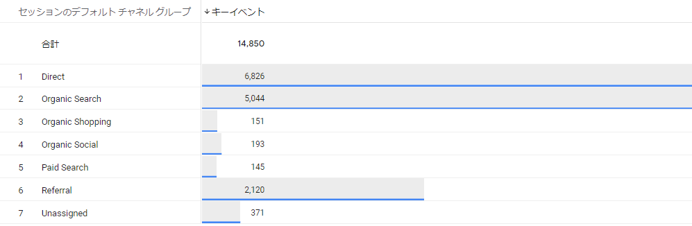 以下では例として、Googleデモアカウントで【セッションのデフォルトチャネルグループ】別の各キーイベント数を確認したい場合のレポートを作成します。