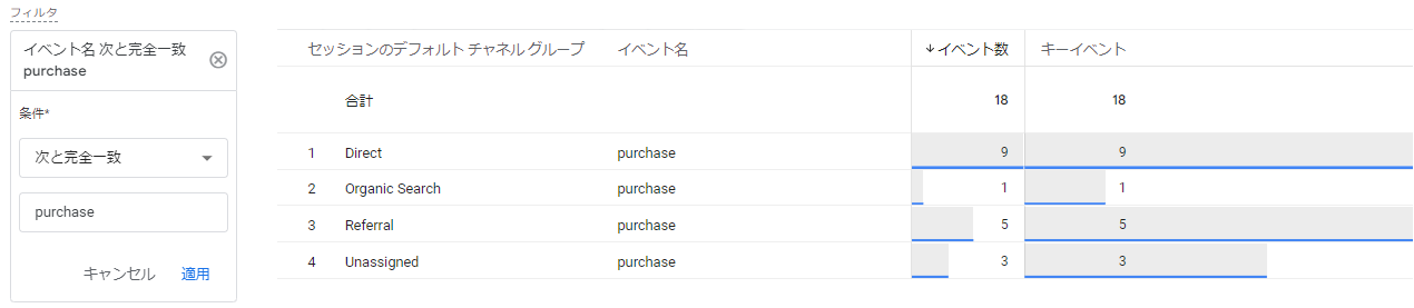 ディメンション【イベント名】に、「次と完全一致」「purchase」と設定することで、purchaseイベントのみの数値を確認できます。