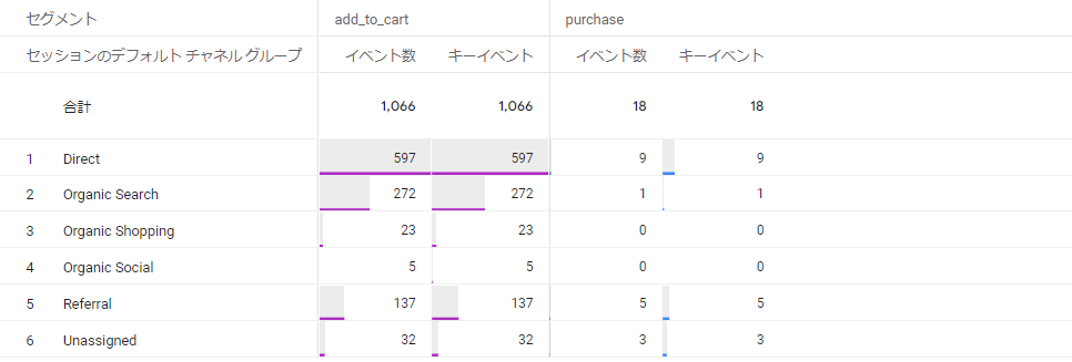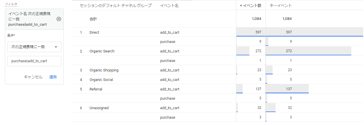 ディメンション【イベント名】に「次の正規表現に一致」「purchase|add_to_cart」と設定することで(キーイベント同士の間に「|」を入力します)、purchaseイベントとadd_to_cartイベントの数値を表示できます。