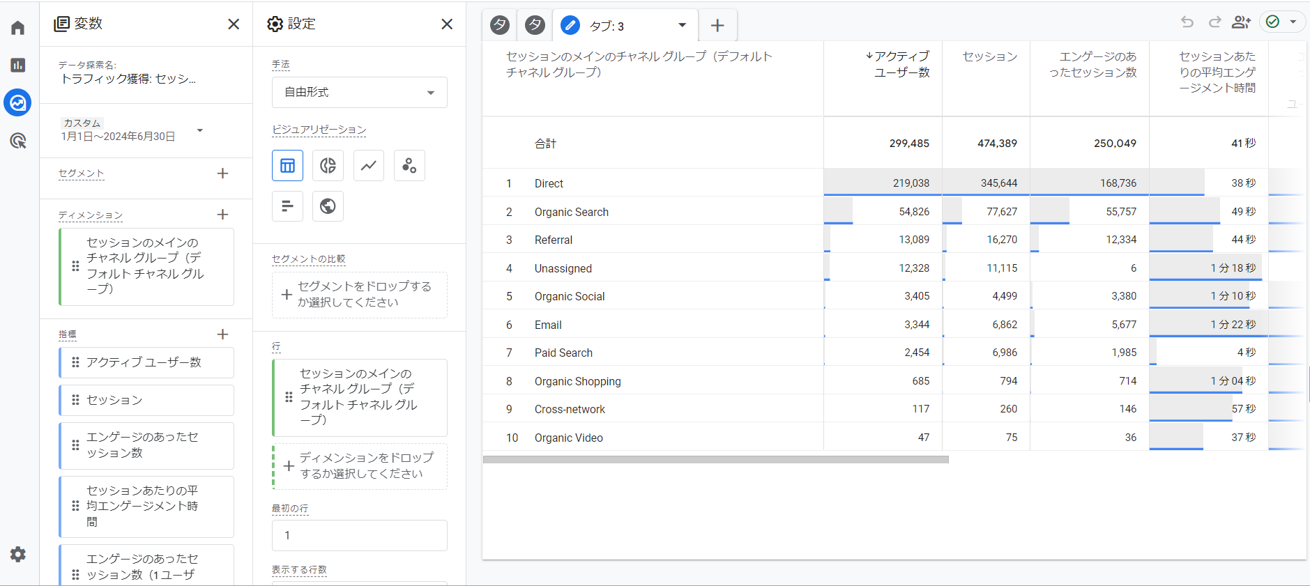 探索レポートは「探索」配下にあるカスタマイズ可能なレポートで、UAのカスタムレポートに相当します。自由にディメンション・指標を組み合わせられるため、KPI増減要因の調査などの深掘り分析に適しています。