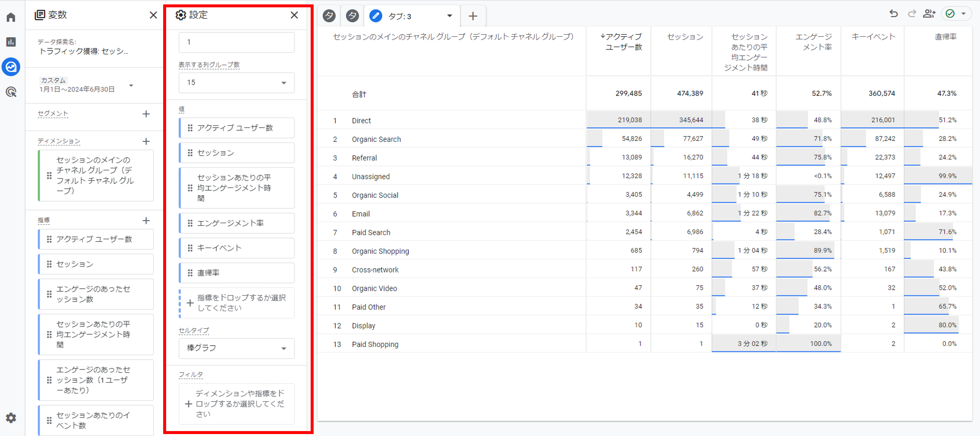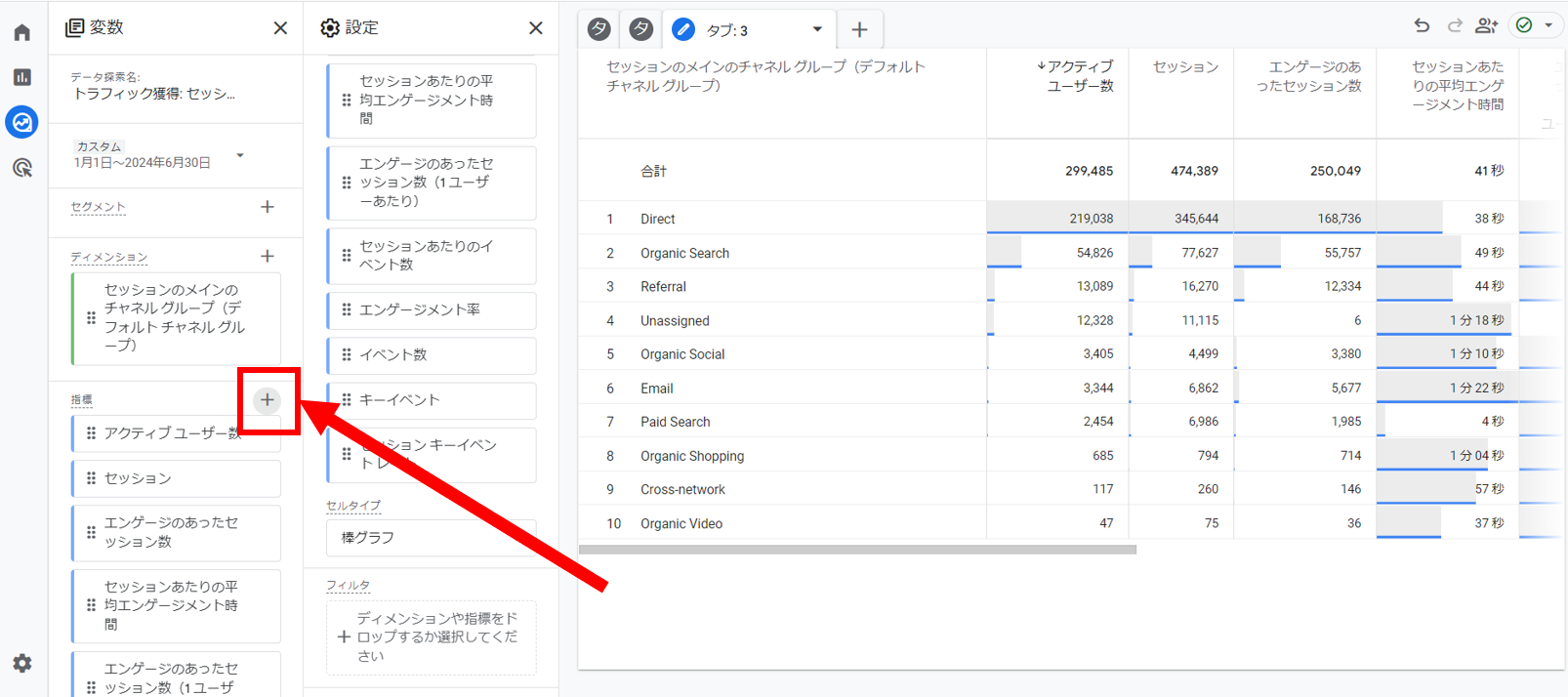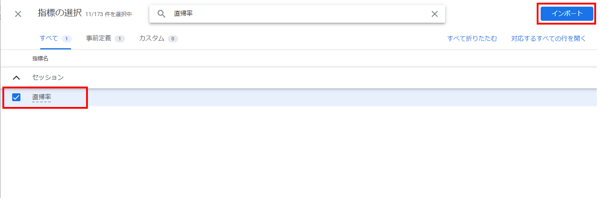 【例】「イベント数」「セッション当たりのイベント数」「エンゲージのあったセッション数」「エンゲージのあったセッション数(1ユーザーあたり)」「セッションキーイベントレート」を削除し、「直帰率」を追加