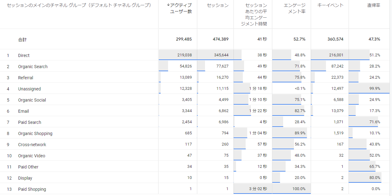【注】「イベント数」や「キーイベント」の数値は、すべてのイベント(キーイベント)の数の合算が表示されます。特定のイベントの数を知りたい場合は、フィルタやセグメント機能をご活用ください。