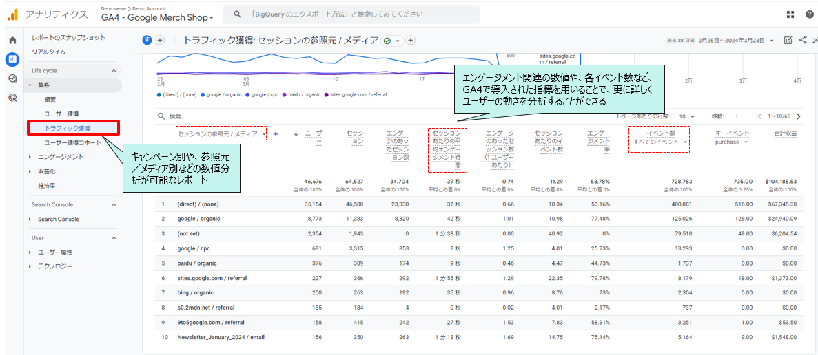 ちなみに、【ユーザー獲得】と【トラフィック獲得】レポートの使い分けですが、【ユーザー獲得】では新規ユーザーを獲得した流入元を表示、トラフィック獲得レポートではユーザーが訪問したすべての流入元を表示します。